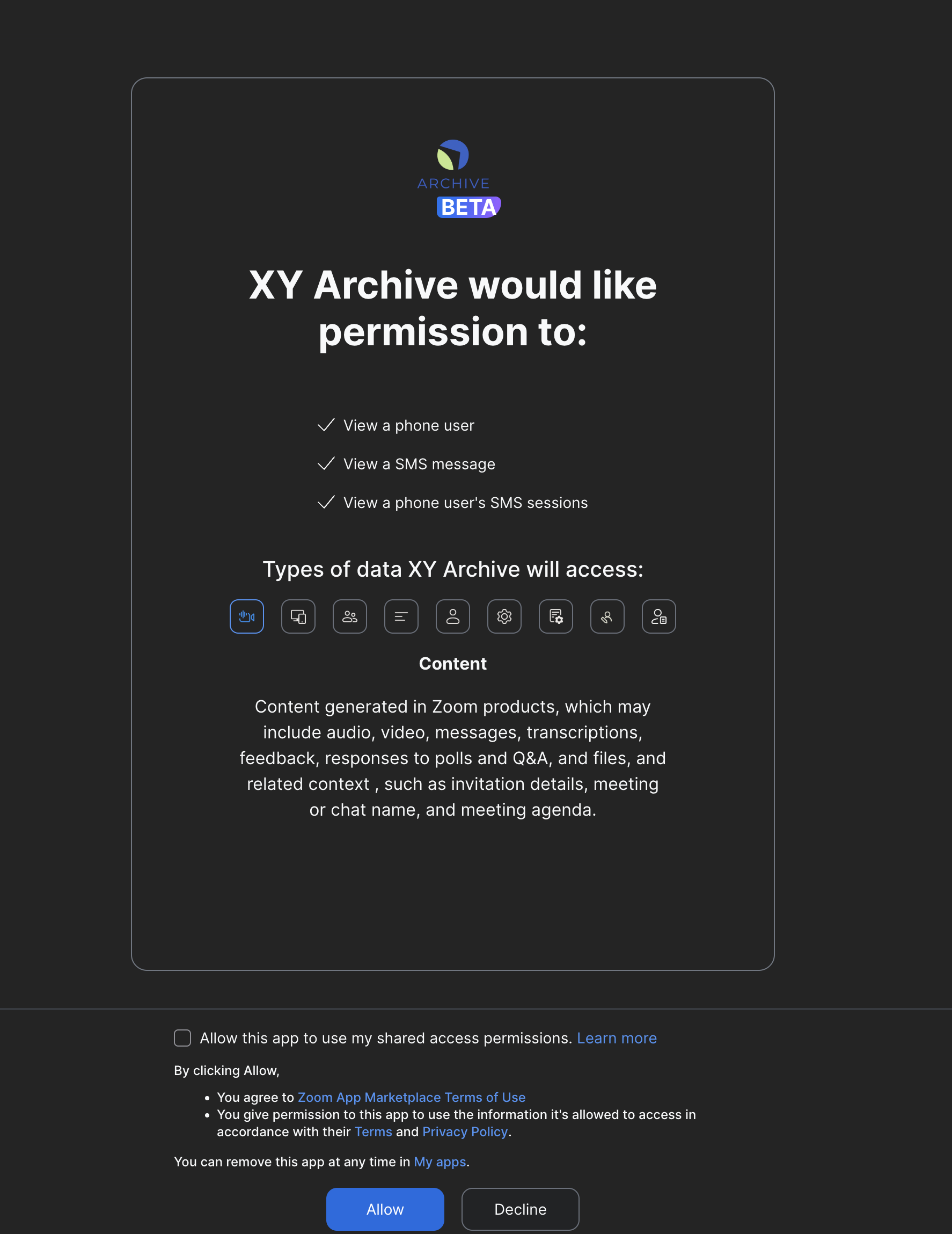 - Click Allow to grant our application access to archive your Zoom SMS texts.